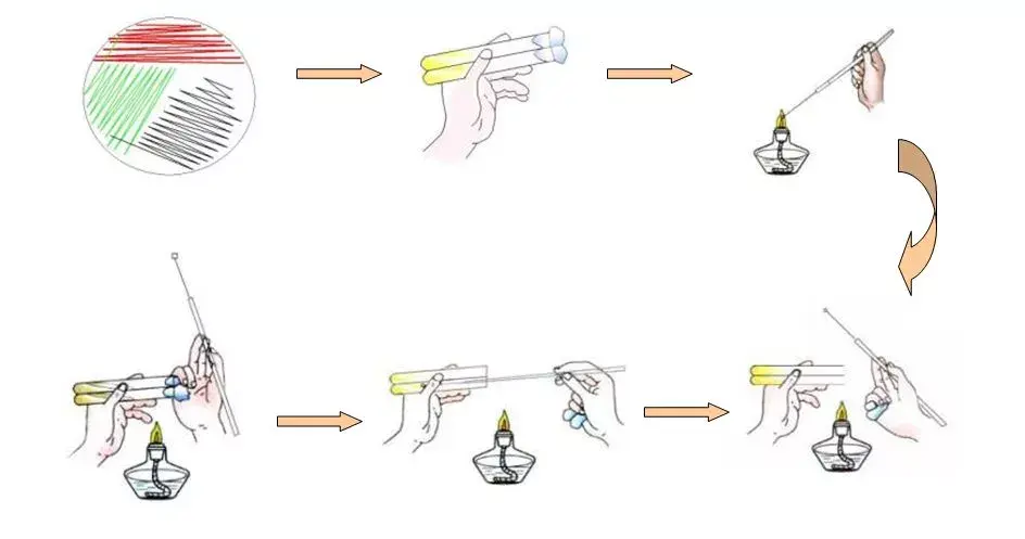 (1)接种灭菌 (2)开启棉塞 (3)管口灭菌 (4)挑起菌苔 (5)接种 (6)塞好棉塞。